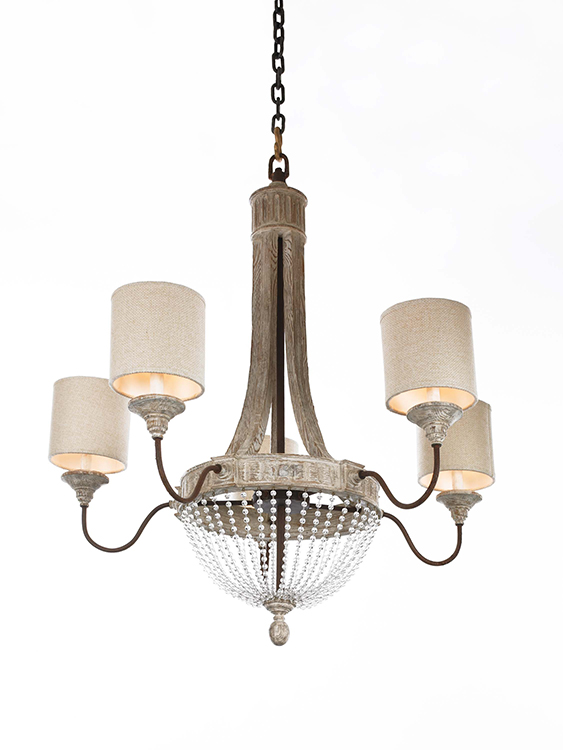 White-wash finish Scandinavian pine with suspended clear beads trim and wrought iron with cast accents with raffia shades.